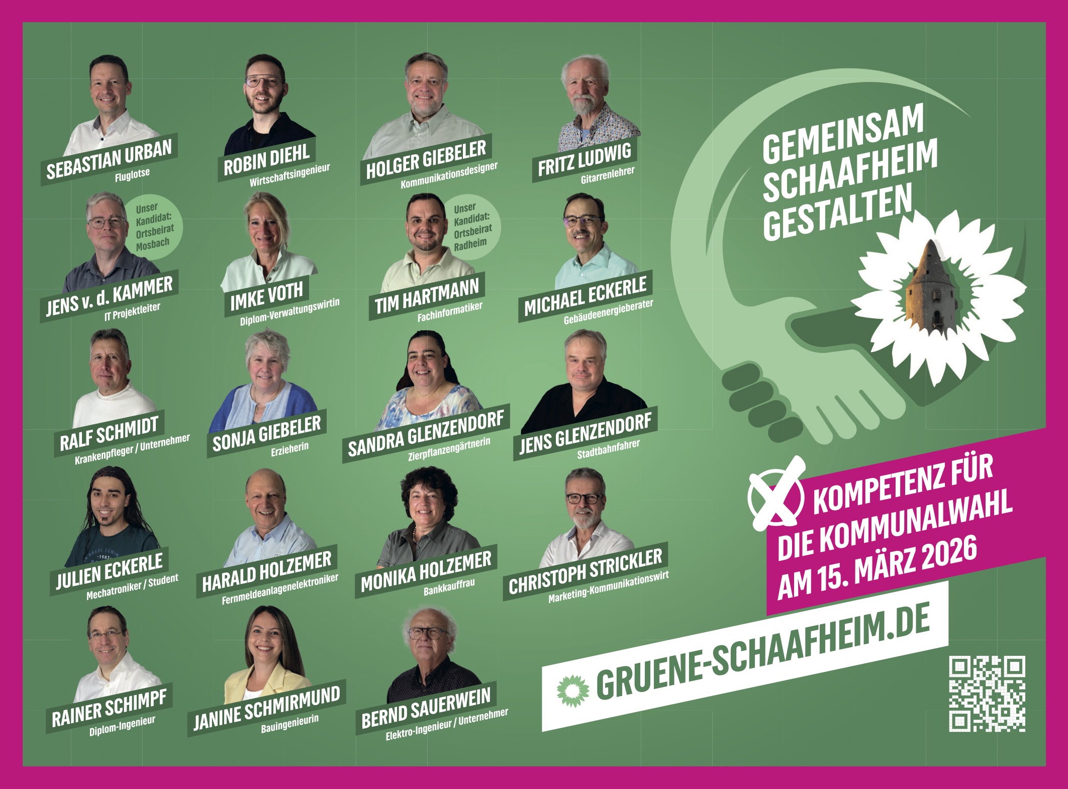Vom Studenten bis zum Rentner, vom Handwerker bis zur Akademikerin: Die Grünen setzen darauf, dass gute Kommunalpolitik von unterschiedlichen Perspektiven lebt. Ihr Motto für den 15. März lautet „Gemeinsam Schaafheim Gestalten“ – und genauso ist die Liste auch gemeint.